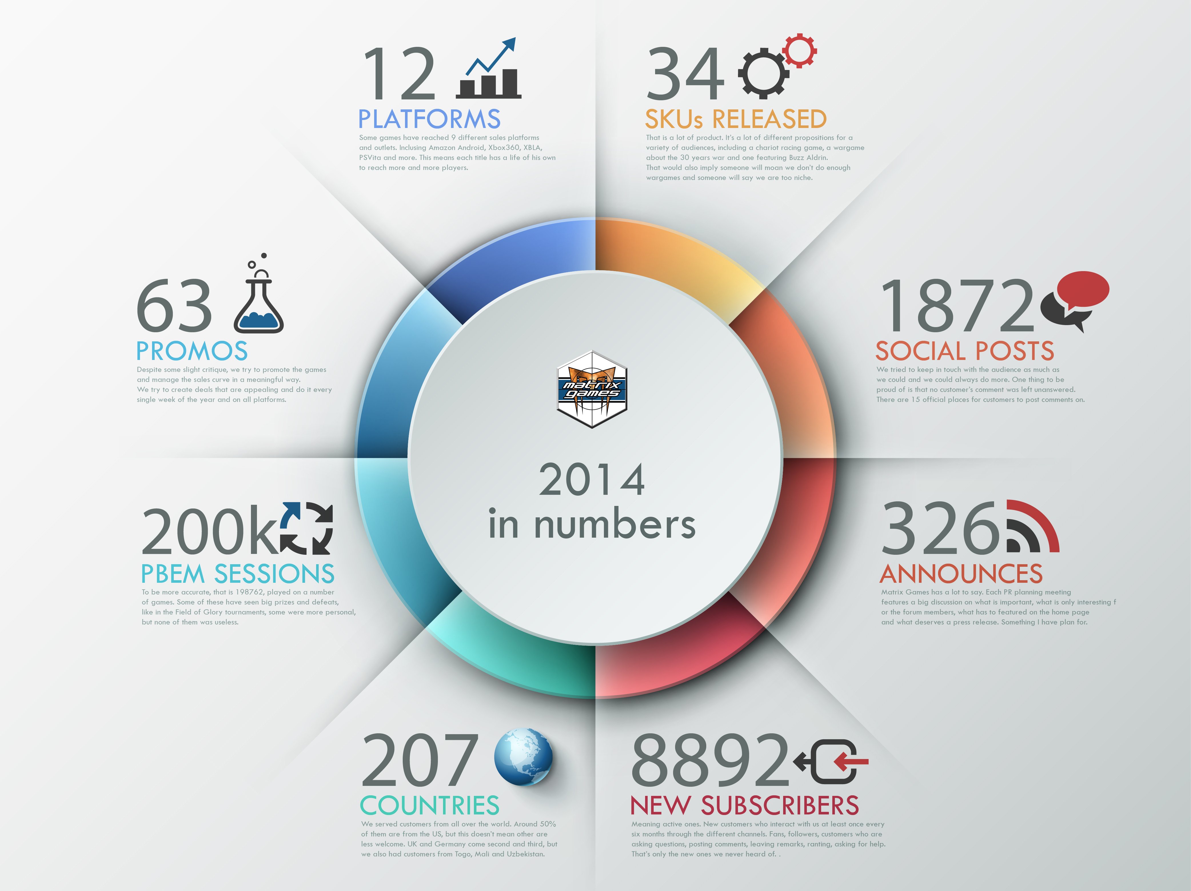 En bref. Matrix Games a diffusé la semaine dernière une intéressante infographie résumant en quelques chiffres clés l’année 2014 pour l’éditeur américain. Qui comme on le comprend ici confirme sa progression sur plusieurs fronts ludiques en même temps, allant de wargames PC destinés à des joueurs chevronnés jusqu’à des jeux de stratégie aux degrés de difficulté et aux thèmes variés, désormais de plus en plus jouables aussi y compris sur consoles et tablettes numériques.