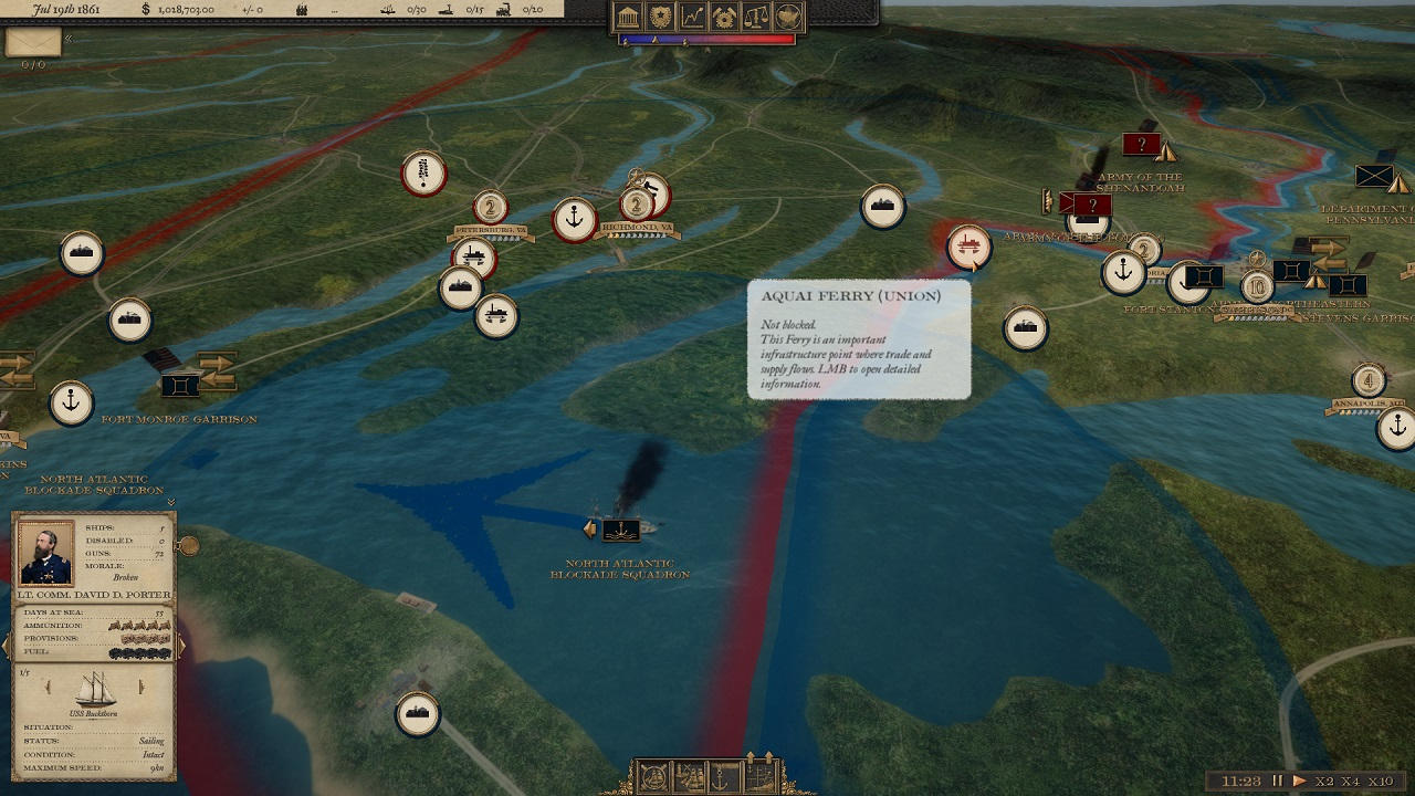 In the Chesapeake Bay, Union has a fleet ready to sail out to meet the Confederate Navy, or to support land operations by bombarding forts or escorting transports to, say, the Peninsula? But who would go on that God-forbidden swampy wasteland? At least any time soon…