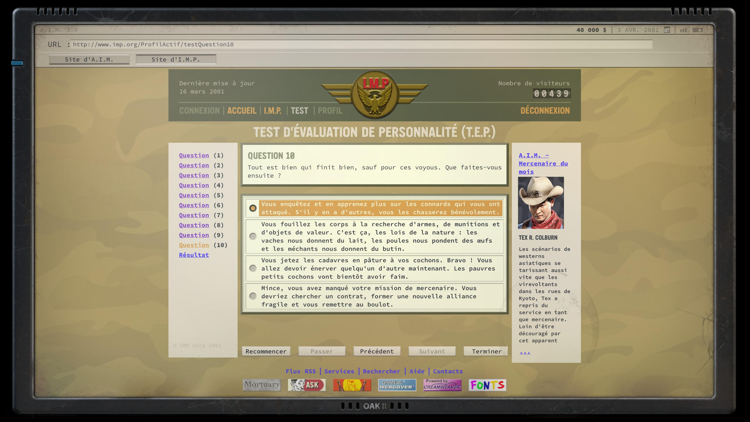 Quand vous allez créer votre personnage principal, vous avez deux choix. Soit utiliser le test de personnalité, un formulaire type QCM avec des situations caricaturales. De vos réponses dépendront le tirage de vos caractéristiques et certaines compétences. Alternativement vous pouvez passez outre le test de personnalité et choisir vous-même vos caractéristiques et compétences.