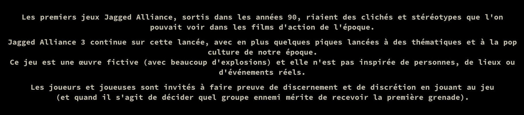 Pour plus d’informations sur Jagged Alliance 3, voyez cette page sur Steam et le site officiel. Voyez également dans nos archives les précédents articles dans lesquels sont résumés d’autres éléments du jeu. Vous pouvez vous procurer Jagged Alliance 3 à prix réduit grâce à notre partenaire Gamesplanet. Utilisez le code promo "Wargamer" pour un bonus supplémentaire. NDLR : cet article est ouvert à tous, ne nécessitant pas d’abonnement pour être lu. Vos abonnements sont importants pour que la Gazette du wargamer puisse continuer d’évoluer tout en proposant aussi des articles en accès libre. Pour soutenir le site et son équipe, abonnez-vous.