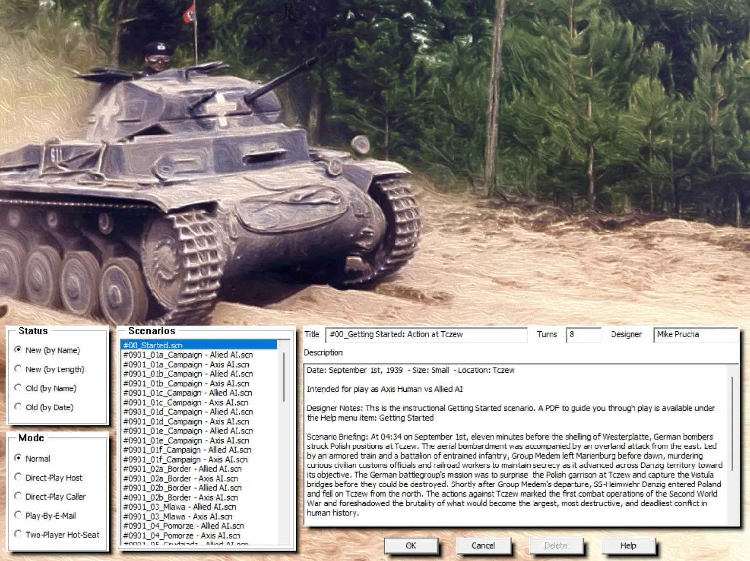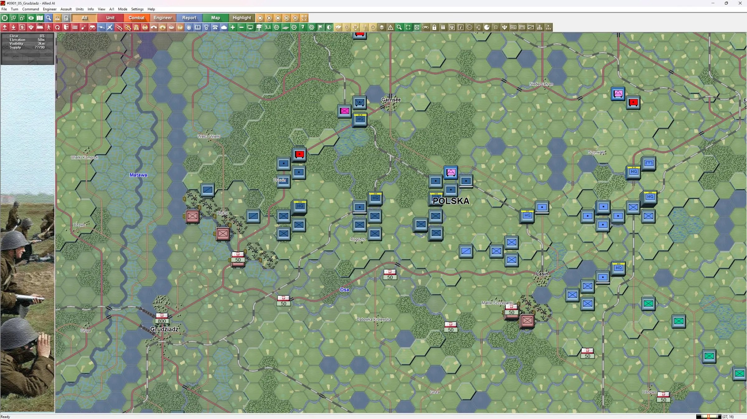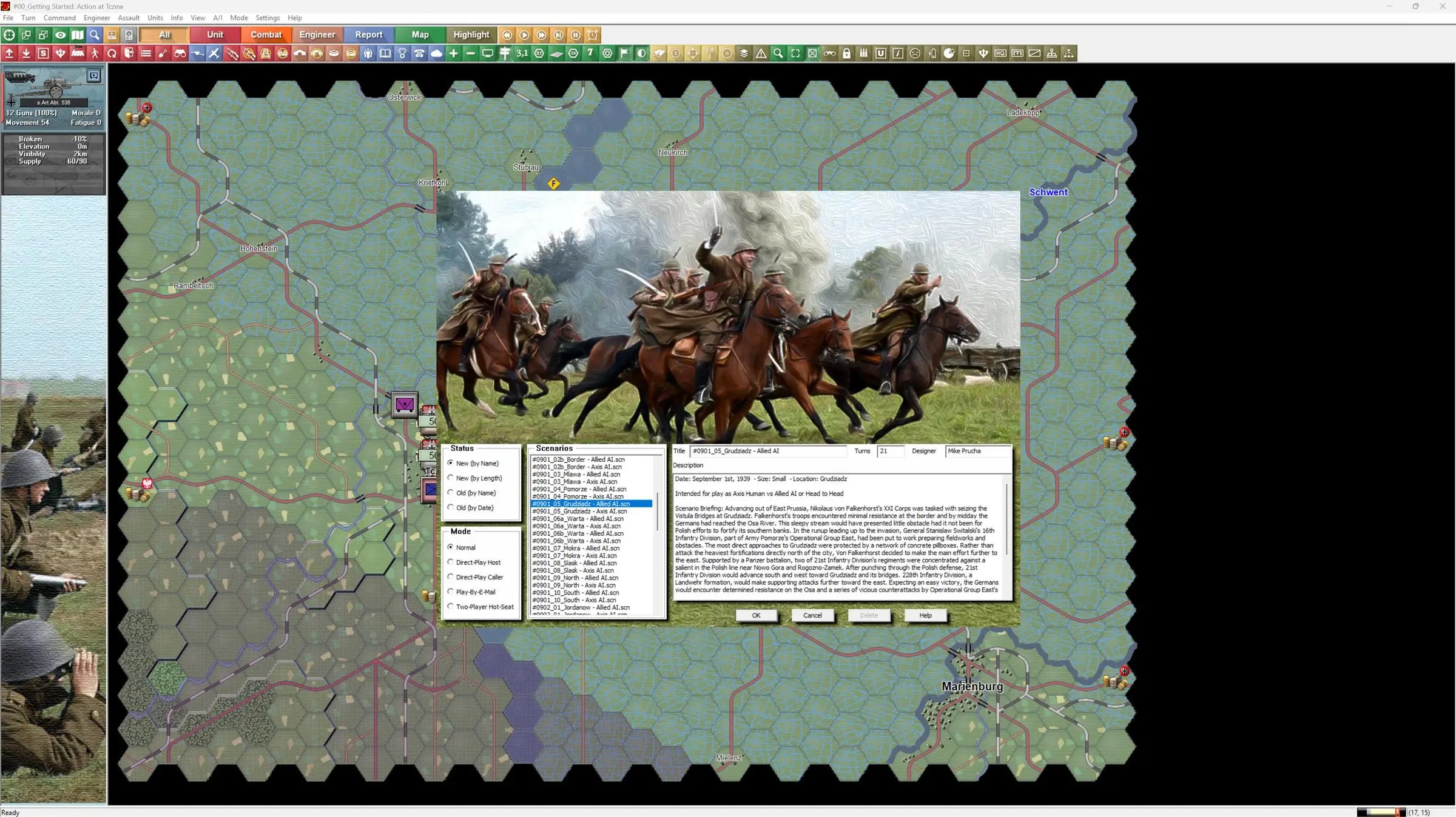 Poland ’39 propose un contenu particulièrement riche avec 77 scénarios couvrant une large variété de situations : affrontements localisés, opérations à grande échelle, et même hypothèses alternatives. Chaque scénario est décliné en plusieurs versions selon le mode de jeu : contre l’intelligence artificielle ou en face-à-face multijoueur, avec des ajustements spécifiques pour garantir un équilibre adapté à chaque configuration. Cette approche permet de rejouer les mêmes événements sous des angles différents, tout en tenant compte des limites de l’IA ou de la dynamique plus imprévisible d’un adversaire humain. On y trouve comme toujours un scénario d’introduction pour faciliter la prise en main, ainsi que des outils d’édition permettant de créer ses propres variantes ou campagnes personnalisées.