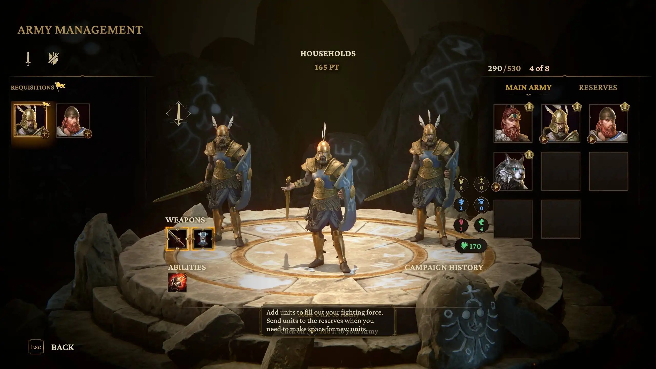 La seconde étape consiste elle à recruter un peu plus de troupes via l’écran de gestion de son armée. En tout début de partie, j’ai ici un potentiel de 530 points à répartir au maximum sur 8 unités différentes. Une unité de miliciens, fragiles mais utiles en soutien, coûte 75 points. Une unité d’infanterie « normale » (épée plus grands boucliers) coûte elle 165 points. Pour passer à la première mission, je n’ai guère de choix, le plus sage est de prendre un renfort de chaque type (soit une plutôt pour l’attaque à distance, une pour le corps à corps défensif comme offensif). Les rangs de votre armée vont se diversifier au fil des missions suivantes. A nouveau, j’aurais été très curieux de pouvoir voir cette diversité vers le milieu de partie, mais il est encore trop tôt pour cela. Disons juste pour l’instant qu’au fil des missions on devine que les troupes vont bien se diversifier.