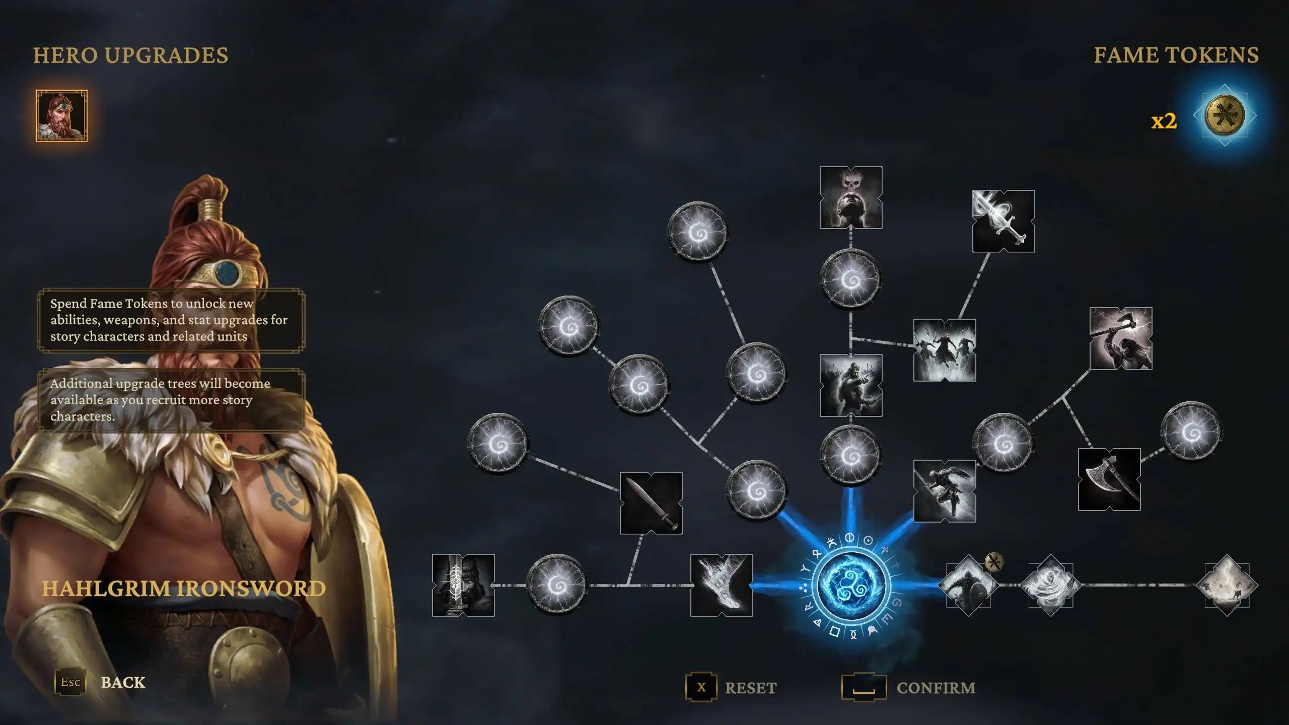 Chaque héros à sa propre arborescence d’améliorations. En conséquence, les points de Gloire m’ayant semblé assez rares quand même, dès que vous aurez rencontré / recruté 3 ou 4 héros, il va falloir bien choisir lequel développer en priorité. De cela dépendra une bonne partie de vos choix tactiques dans les missions suivantes. Par exemple, vaut-il mieux augmenter les points de vie de vos troupes, afin qu’elles encaissent mieux les coups ? Ou vaut-il mieux augmenter les points de vie de votre principal héros, Halgrim, qui est celui qui va être la plupart du temps en première ligne ?
