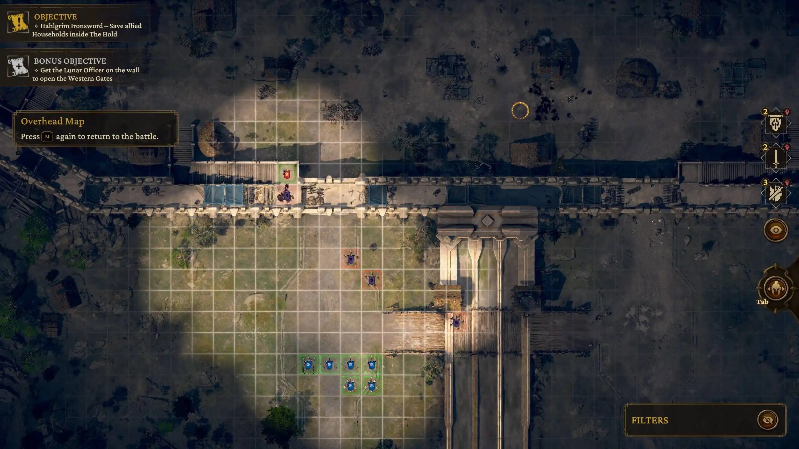 Quid du héros Lunar penserez-vous peut-être. En résumé c’est une sorte d’éclaireur, de personnage rapide, disposant d’une redoutable attaque spéciale avec des armes empoisonnées. Il a aussi une compétence passive pratique, qui lui permet d’avoir une meilleure ligne de vue que les autres unités. C’est pratique donc pour dissiper un peu plus le brouillard de guerre. Il est toutefois moins solide, moins costaud que votre héros principal, le jeune chef barbare, et donc il faudra faire un peu plus attention avec lui à ce qu’il ne soit pas trop exposé. Et voir comment peut-être l’améliorer par la suite, mais alors au détriment de votre guerrier. Quoiqu’il en soit, dans cette mission, il est utile pour occuper un peu les maraudeurs le temps que vous arriviez à l’intérieur.