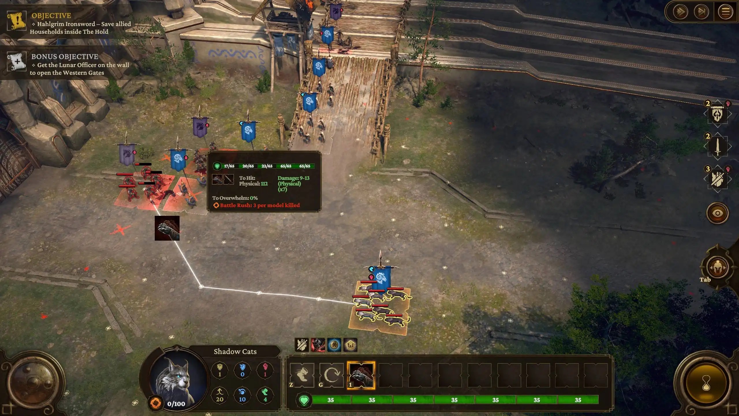 Enfin, je n’ai pas parlé d’un troisième type d’unité que vous avez, les Shadow cats, qui sont donc des sortes de gros chats sauvages utilisés en soutien par vos troupes (normalement pour la chasse, semble-t-il), gros félins qui correspondent à une sorte de cavalerie très légère. Ils ne sont pas solides, mais par contre sont très rapides, donc très utiles pour certains mouvements, contourner un ennemi, attaquer de flanc, etc, avant une charge plus dévastatrice par exemple d’un de vos héros. Libre à vous par la suite quand vous ajusterez les rangs dans votre armée des les garder ou non, sachant qu’avoir une armée équilibrée et variée dans ses capacités est un avantage indéniable si l’on utilise bien les différentes capacités de chaque type d’unité.