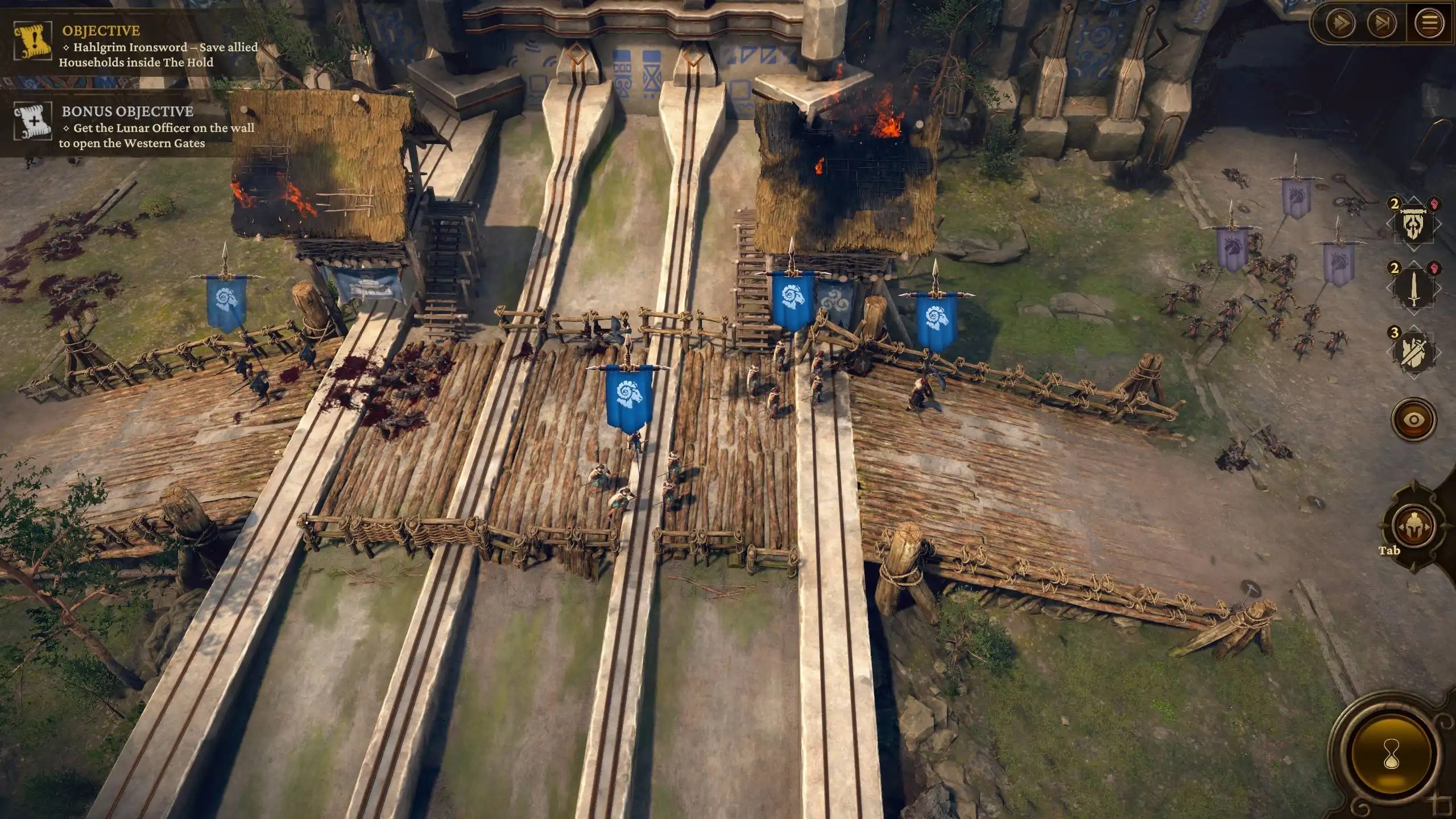 Une fois fini le court tutoriel d’introduction, à savoir une escarmouche avec des maraudeurs du Chaos dans une forêt voisine de votre village fortifié, armée du Chaos qui envahit donc sans prévenir votre paisible région, avant de se lancer dans le premier vrai scénario de la campagne, il faut passer par deux rapides étapes.