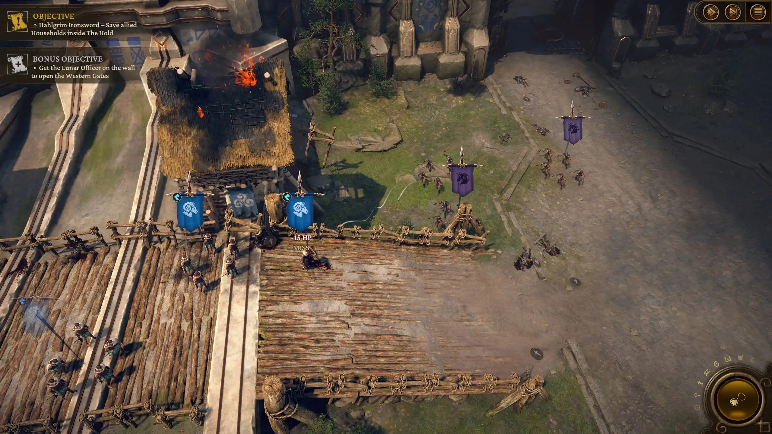 Cette première bataille n’est pas très compliquée. Elle permet de bien mettre en application ce que l’on a vu dans le tutoriel, d’affronter plus d’ennemis, et de voir ce que donne un environnement « urbain ». Les adversaires sont les mêmes que précédemment, de classiques maraudeurs Broos soutenus par quelques shamans. Il y avait de la cavalerie Broo, mais elle s’est enfuie au début, on la retrouvera dans le scénario suivant. En conséquence, sans le soutien de la cavalerie, les maraudeurs et shamans du Chaos sont donc assez affaiblis, pour ainsi dire presque piégés avec les assiégés par votre contre-attaque.