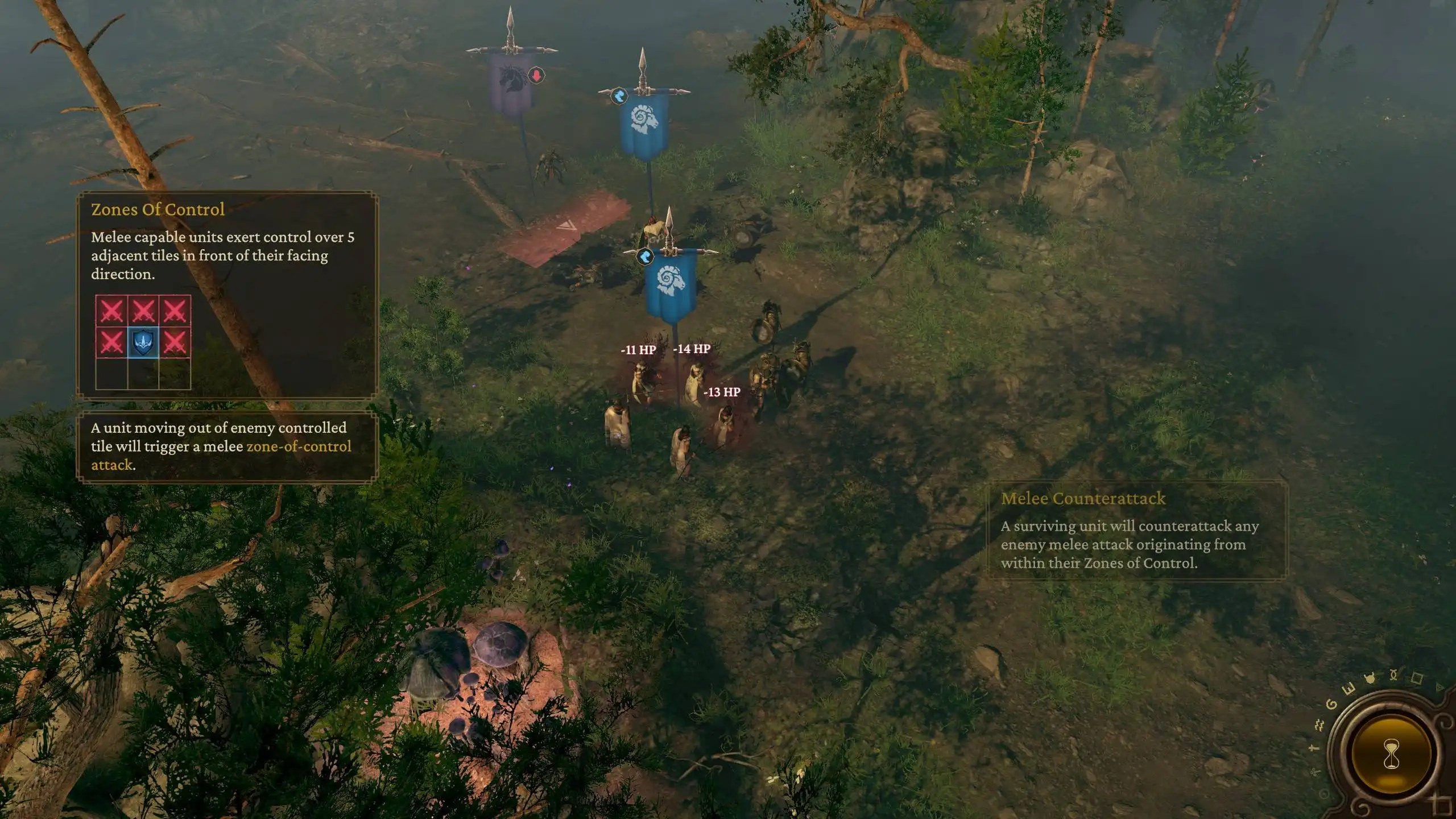 Le jeu utilise une grille orthogonale, et permet heureusement de se déplacer en diagonale. Les unités ont une zone de contrôle qui leur permet de réagir, donc attaquer, tout ennemi passant à coté d’elles. Sauf certains cas particuliers avec l’utilisation d’un pouvoir ou d’une compétence spéciale.