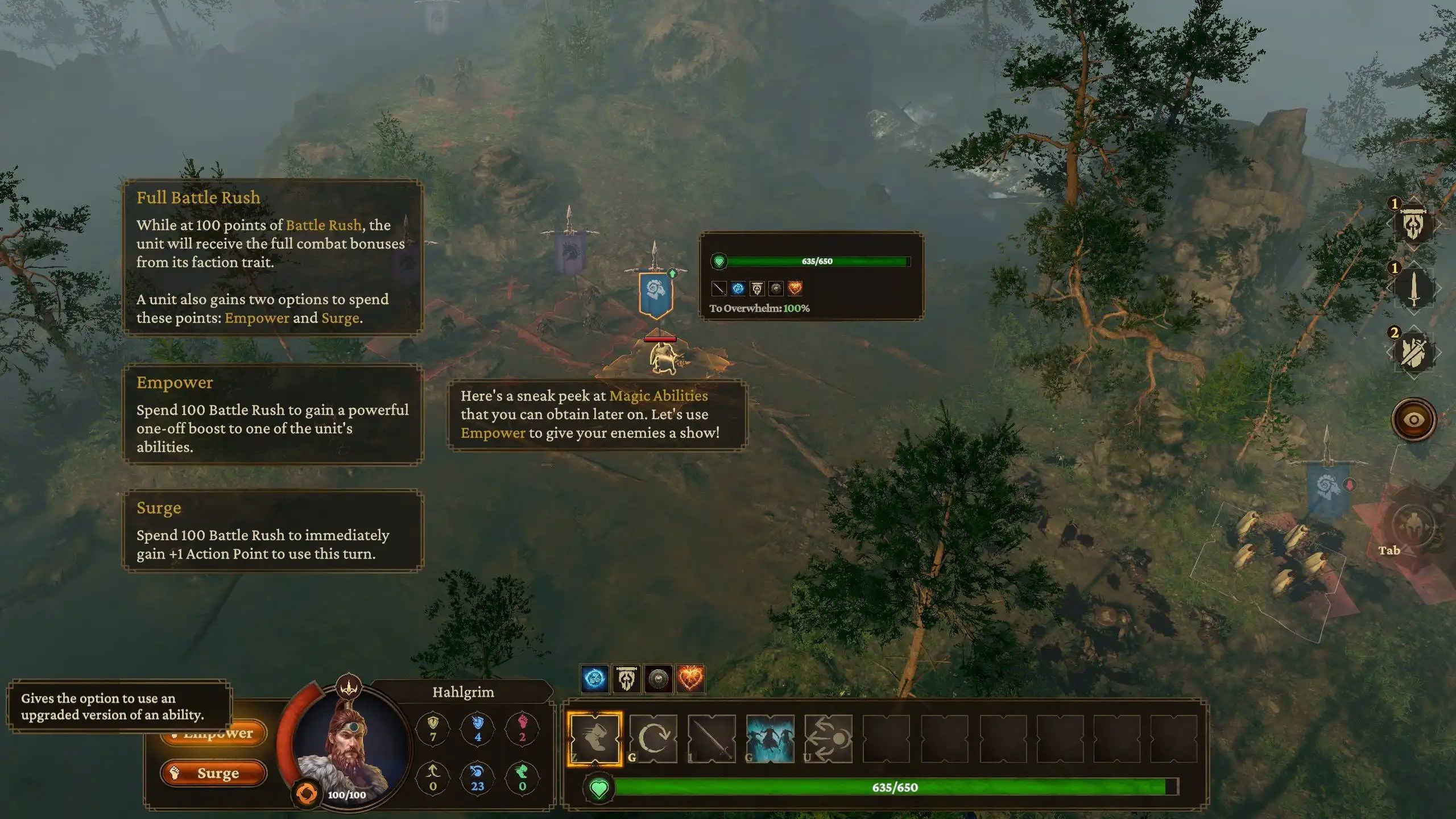 Niveau mécanisme de jeu, sachez quand même qu’une unité de base à en général 1 point d’action et 4-5 points de mouvements. Un héros aura lui 2 points d’action et un peu plus de points de mouvements. Donc concrètement, un héros une fois bien positionné pourra attaquer deux fois. Autre originalité, au fil des combats chaque unité accumule des points dit de Battle rush. Chaque faction aura un bonus spécial au combat avec ces points, et quand on en a 100, on peut les dépenser pour soit obtenir un précieux point d’action supplémentaire, soit augmenter la puissance d’une capacité spéciale. Ce mécanisme simple pimente un peu plus les choix à effectuer.
