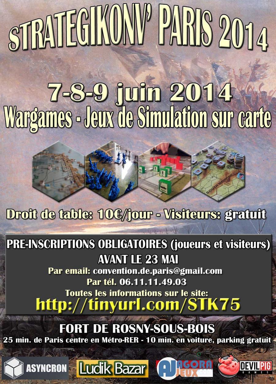AccueilActus ActusDiversStrategikonv’ Paris 2014Par Bertrand L.25 mai 2014J -12 avant le début à Paris de la convention organisée par des membres du forum Strategikon, de l’association Frog Of War et du club parisien du 13° Stratège. Cliquez sur l’affiche pour accéder au site de la manifestation.Jeu(x) / éditeur(s)Asyncron GamesArticle précédentAu menu cette année chez Iceberg InteractiveArticle suivantSortie de Storm Over Dien Bien Phu ActusJ-25 pour Xenonauts 2 9 mars 2026Age of Wonders 4 – Rise from Ruin : nouvelles vidéos 9 mars 2026Heart of the Machine ? IAmancien ? 8 mars 2026Derniers testsFlashpoint Campaigns – Cold War, la guerre sans fin Sword and Siege – Age of Longbow : quand chaque volée décide...
