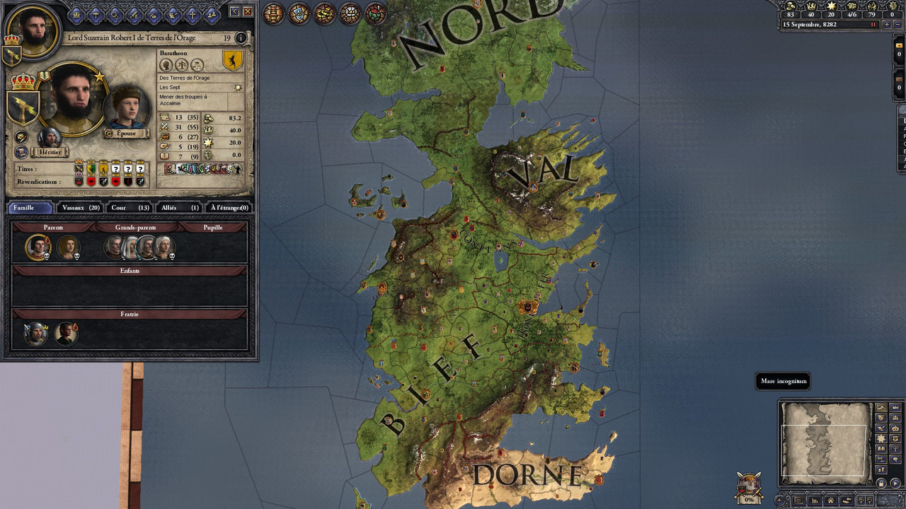 Non, il s’agit en fait ici d’un mod assez ambitieux qui permet de convertir le non moins excellent Crusader Kings II à l’univers créé par George R.R. Martin. La récente mise en ligne de la première version du mod (une Totale Conversion en fait) a retenu l’attention, non pas du fait de la très belle représentation cartographique de Westeros, mais surtout grâce à une jouabilité convaincante. Du moins pour une jeune bêta et si l’on en croit les premiers échos sur le Web (entre autre cet article sur Techspot). Ce nouveau mod se base essentiellement sur le livre A song of Ice and Fire et s’inspire d’un précédent mod pour Crusader Kings premier du nom, Westeros mod – War of the usurper, mod désormais arrêté par son créateur (déçu par les derniers romans). Les wildlings ne sont pas encore présents dans ce nouveau mod, mais cette faction devrait être ajouté par la suite. Le postulat de départ se résume comme suit :